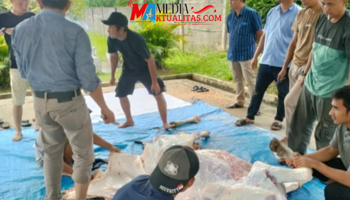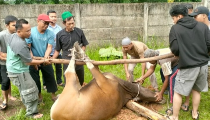 Penyembelihan dua Sapi dan dua kambing yang dilaksanakan setelah pelaksanaan sholat Idul Adha. Senin (17/6/2024).