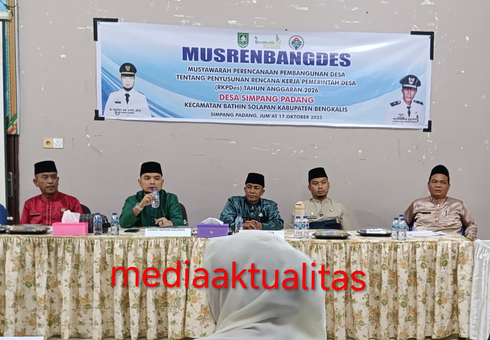 Pemerintah Desa Simpang Padang, Kecamatan Bathin Solapan, Kabupaten Bengkalis, menggelar Musyawarah Perencanaan Pembangunan Desa (Musrenbangdes) tahun 2025 untuk menyusun RKPDes Tahun Anggaran 2026, Jumat (17/10/2025).