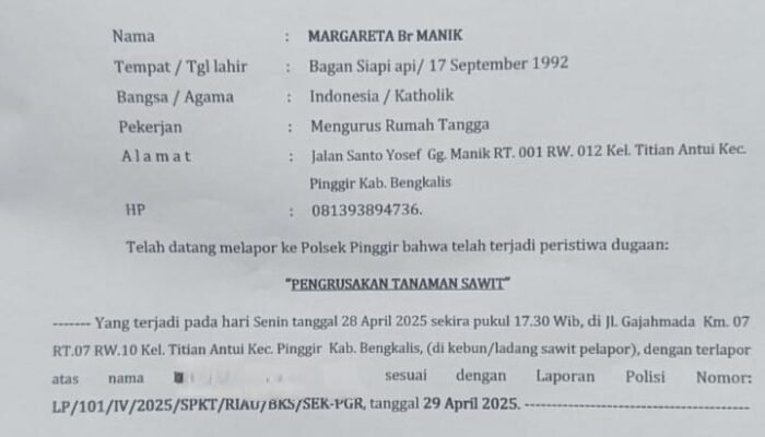 Laporan tersebut resmi masuk pada 29 April 2025, sebagaimana tercantum dalam Surat Tanda Terima Laporan (STTL) yang diterima redaksi. Kasus ini melibatkan dugaan pengrusakan puluhan batang sawit menggunakan alat berat di lahan kebun Margareta yang terletak di Kelurahan Titian Antui, Kecamatan Pinggir.