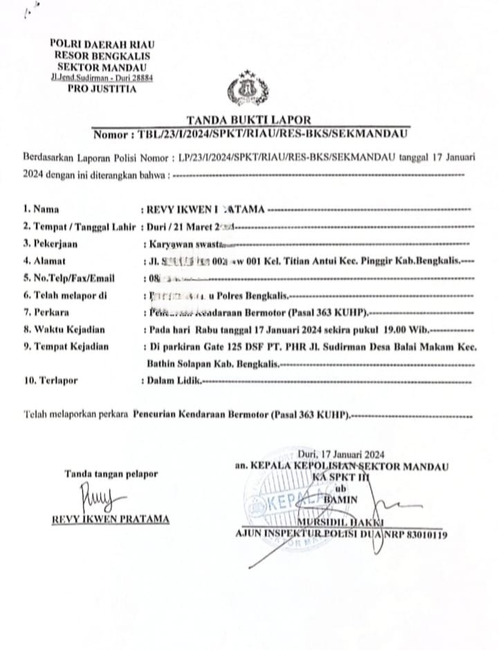 Laporan dengan Nomor: TBL/23/I/2024/SPKT/RIAU/RES-BKS/SEKMANDAU tertanggal 17 Januari 2024 tersebut sebelumnya dibuat di Polsek Mandau oleh Revy Ikwen Pratama.