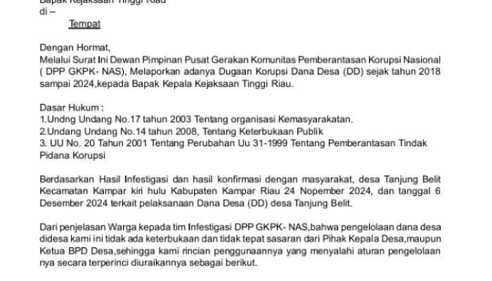 Aroma busuk dugaan korupsi Dana Desa (DD) di Desa Tanjung Belit, Kecamatan Kampar Kiri Hulu, Kabupaten Kampar, kian menyengat. Oknum Kepala Desa setempat, Efri Desmi, diduga telah memanipulasi laporan pertanggungjawaban dan menyulap sederet proyek menjadi fiktif demi menguras dana desa selama bertahun-tahun.