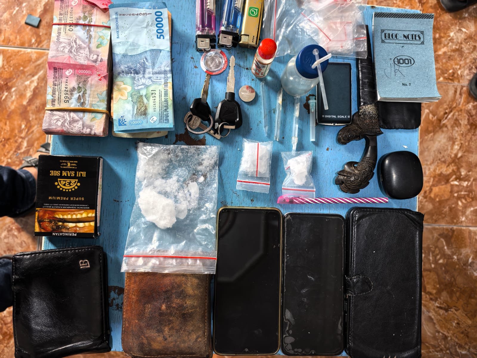 Dari lokasi, petugas berhasil menyita sejumlah barang bukti yang cukup mencengangkan, di antaranya sabu-sabu seberat ±35,99 gram, timbangan digital, alat hisap, dua unit handphone, uang tunai Rp10 juta, hingga senjata tajam jenis belati.