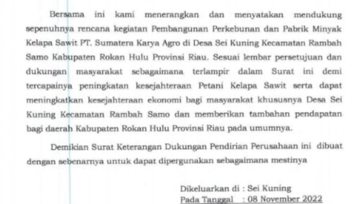 “Benar, untuk pendirian PKS PT. SKA saya yang tanda tangani bersama Camat Rambah Samo, dengan isi persetujuan pendirian PKS untuk membantu perekonomian masyarakat desa, dan ini merupakan bagian program Pemkab Rohul,” sebut Kades. Namun, seiring dengan persoalan yang muncul, dirinya mengatakan apa yang dilakukan PT. SKA sejauh ini di luar perkiraan dan lari dari tujuan awal.